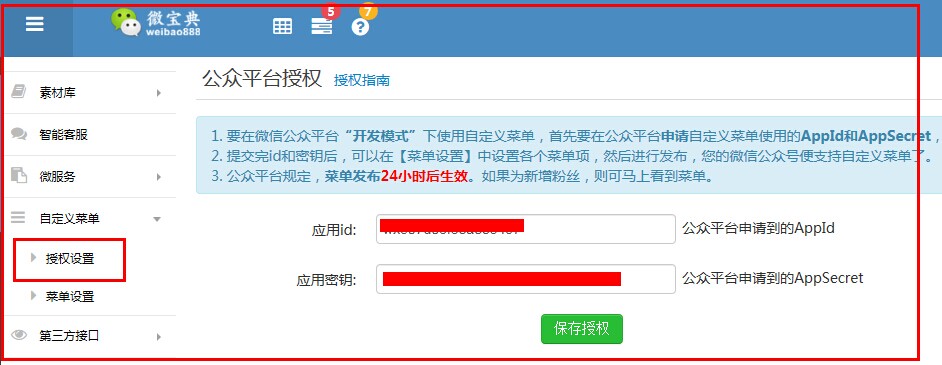 需要登录“微信公众号” https://mp.weixin.qq.com 获取 APP ID和 App Secret 填入 微宝典 系统;授权自定义菜单