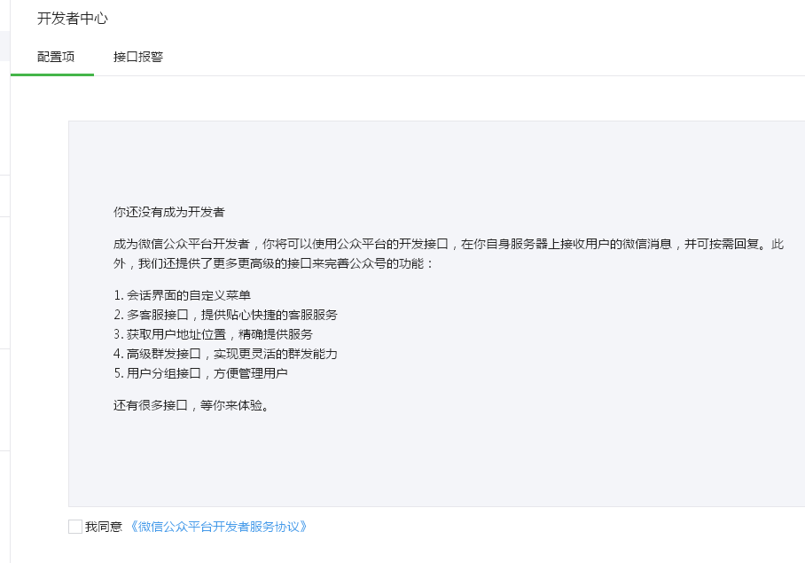 1、登录微信公众账号管理平台——开发者中心 选择我同意 《微信公众平台开发者服务协议》 点成为开发者