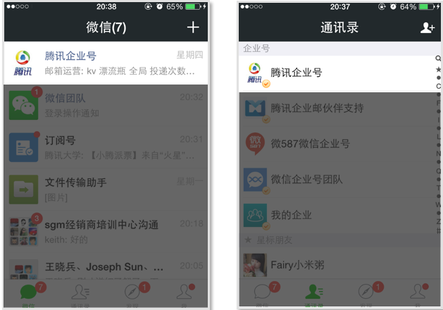 企业号出现在微信会话列表首层,在通讯录中有单独的分类。
