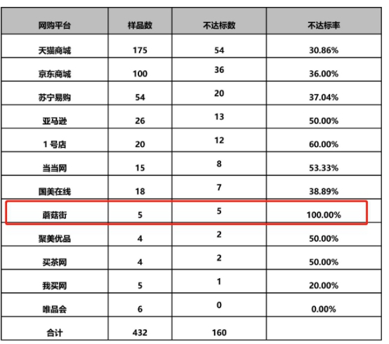 统计数据显示,天猫商城、京东商城、苏宁易购和国美在线4个平台均有超过三成样品不达标,亚马逊、聚美优品和买茶网3个平台有一半样品不达标,1号店和当当网2个平台均有超过一半样品不达标。其中,蘑菇街5个样品全部不达标,不达标率百分之百。