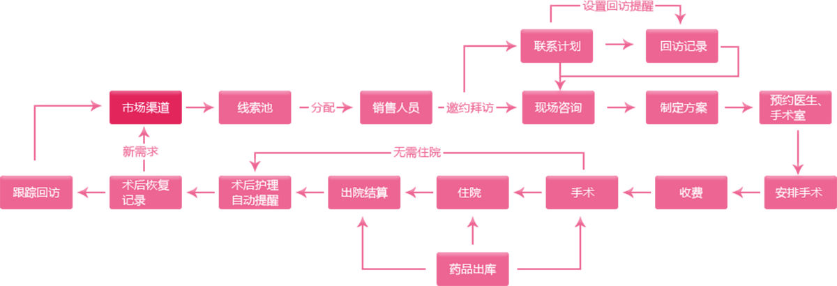 完成营销、咨询、购买、预约、治疗、随访、分享,从服务到再服务的闭环。