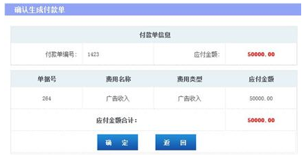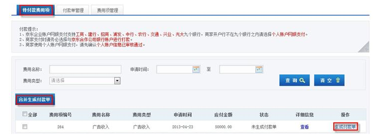 此页面显示需要商家支付的费用项,商家可以支付一笔费用或者多个费用合并支付。见下图:
