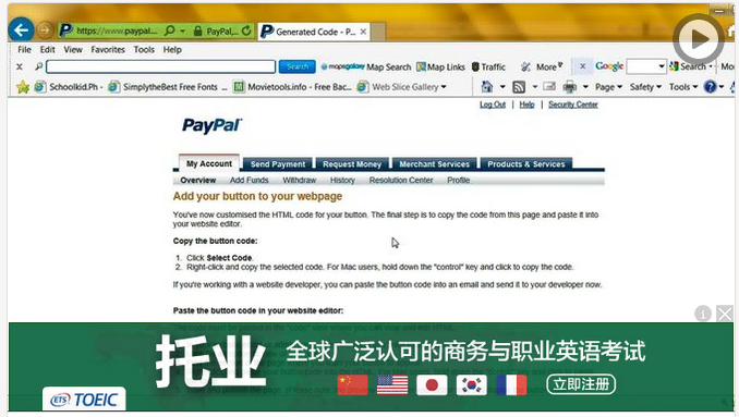 在你的账户页面上选择“商业服务”(Merchant Services)。你将看见一个“为你的网站建立付款按钮”(Create payment buttons for your website)的按钮。点击此按钮。